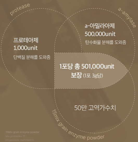 아밀라아제 (탄수화물분해효소) 500,000 unit + 프로테아제(단백질분해효소) 1,000 unit 한포당 총 501,000 unit를 보장해 주는 고역가수치를 보장하는 효소입니다.