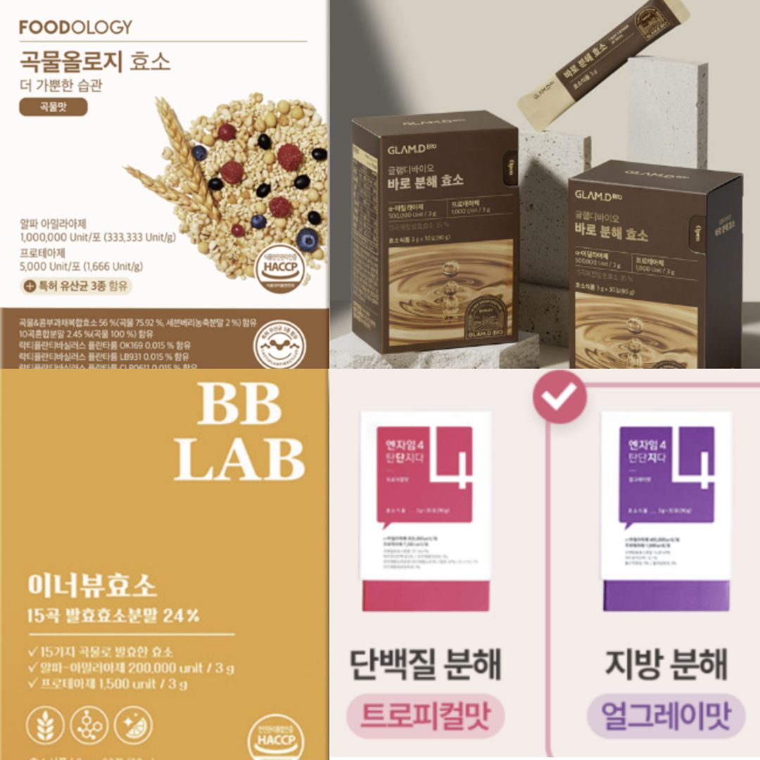 | 종류 | 비비랩 이너뷰효소 | 글램디 바로분해효소 | 곡물올로지 효소 | 탄단지다 멜팅온 효소 |