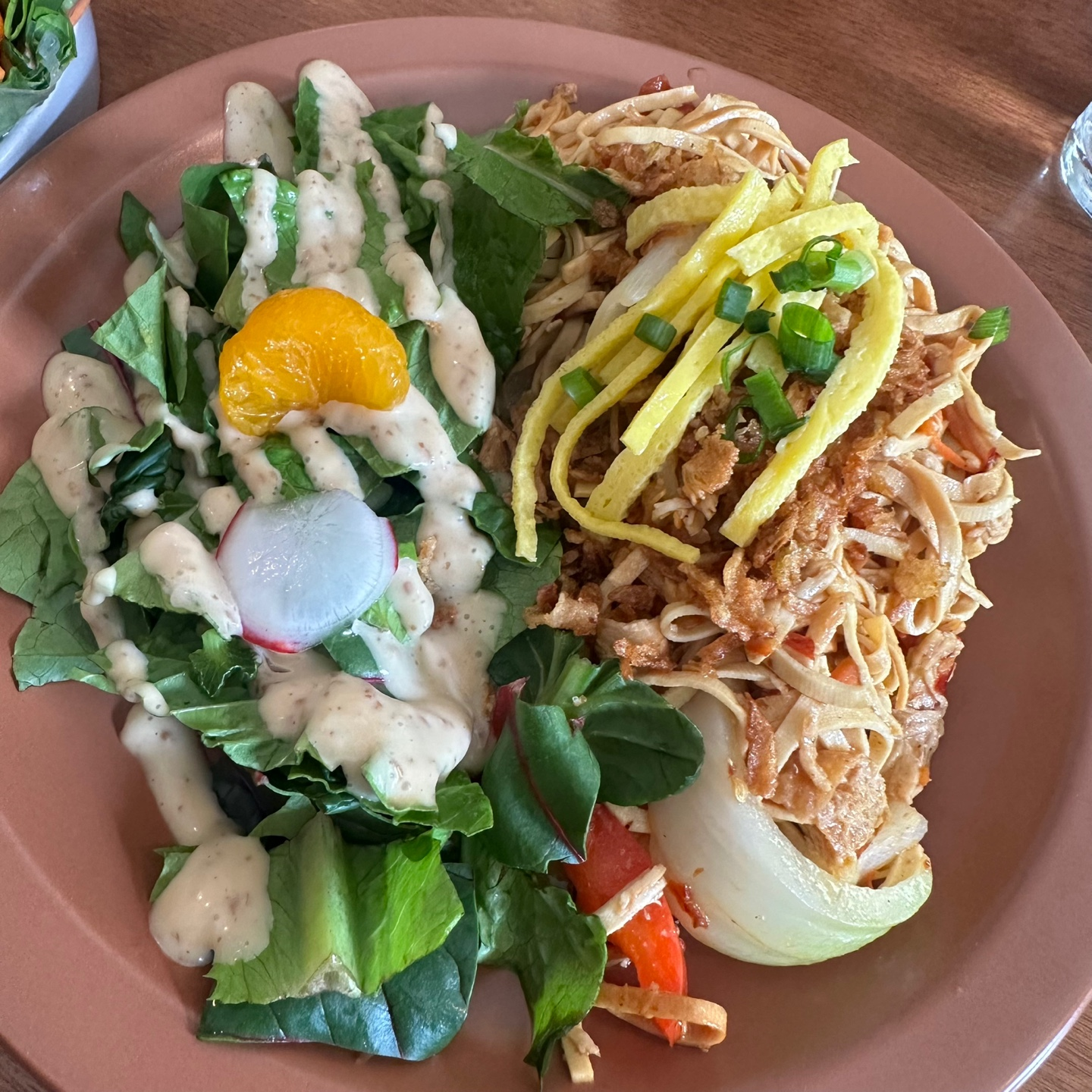 두부면, 닭가슴살, 양파, 파프리카, 당근, 유부, 계란지단, 어니언칩, 실파, 미니샐러드