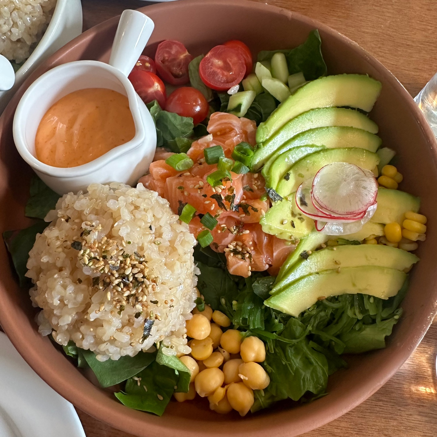 현미,연어,아보카도,로메인,비타민,적근대,구운옥수수,칙피,오이,방울토마토,해초샐러드,실파,후리가케,래디시