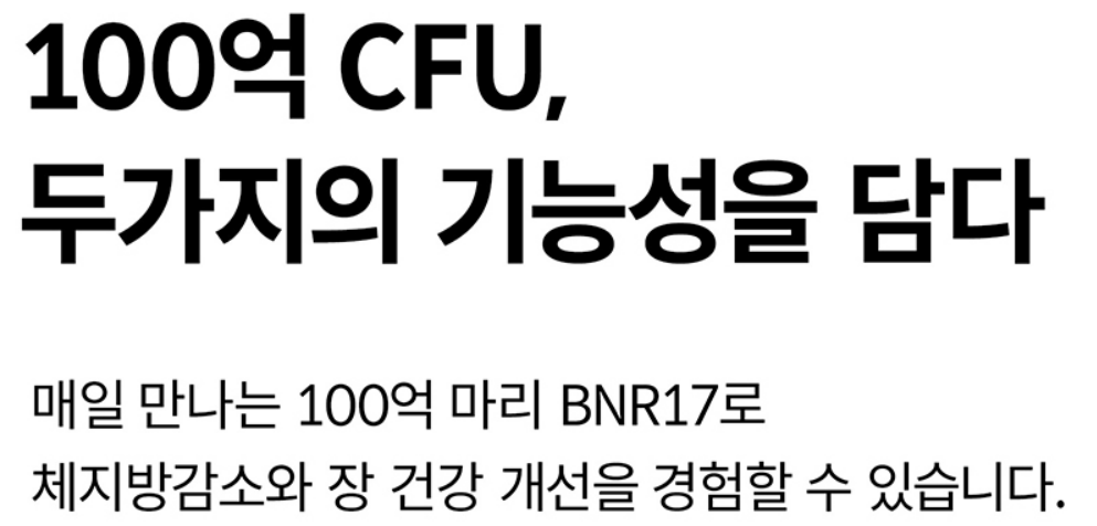 락토바실러스 가세리 비엔알 17 (Lactobacillus gasseri BNR 17)이 국내 최초로 체지방 감소 기능성을 인정 받은 유산균인 것은 높게 평가하나 유산균수 100 CFU를 보장하는 것에 비해 가격이 비싸다는 개인적인 생각이고