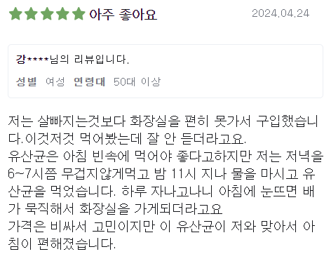 그렇지만 우리가 원하는 건 유산균의 효과가 있으면서 다이어트에도 도움을 줄 수 있는 부분인데, 수백 건에서 많게는 수천 건의 후기를 살펴보았지만 화장실은 잘 가지만 다이어트는 잘 모르겠다는 후기가 많았기 때문에 가격대비 중간정도의 효과가 있는 것 같다