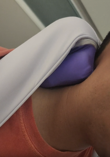 제품의 스트랩을 손으로 잡아당기면 어깨에 완전히 밀착되어 더 강력한 압을 느낄 수 있습니다.